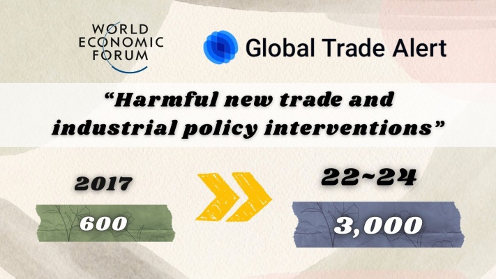 Citing data from Global Trade Alert, the World Economic Forum (WEF) reported that the number of harmful new trade and industrial policy interventions has surged from