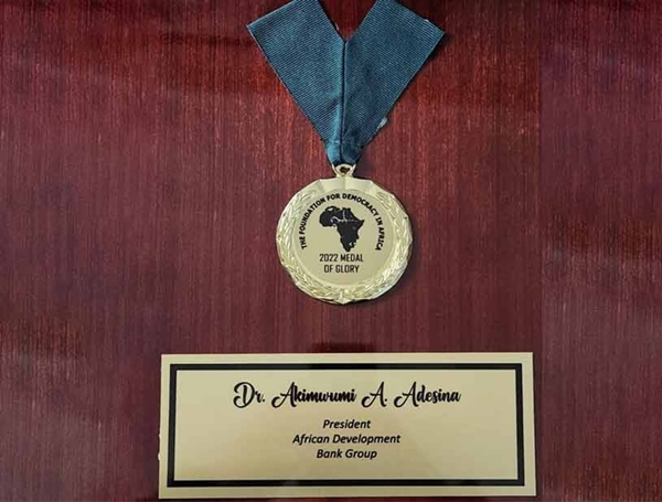 미국에 기반을 둔 옹호 및 연구 싱크탱크인 아프리카 민주주의 재단(Foundation for Democracy in Africa)은 그의 모범적인 리더십을 인정한 Akinwumi Adesina 아프리카 개발 은행(African Development Bank) 총재에게 최고의 메달 오브 글로리 상을 수여했습니다.
