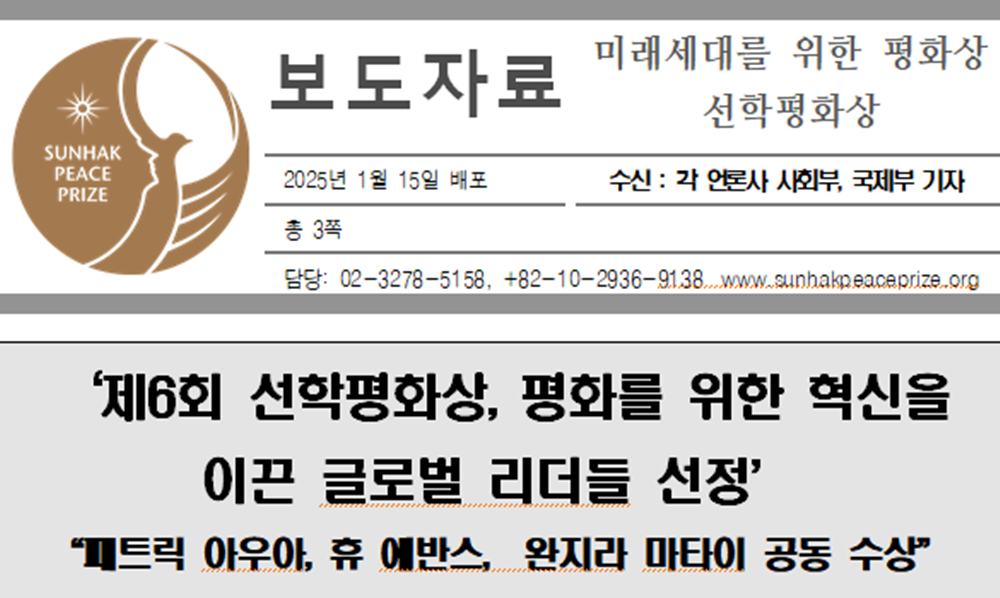 2025년 1월 15일, 서울 – 선학평화상위원회(위원장 호세 마누엘 바로소, 前 유럽위원회 집행위원장)는 제6회 선학평화상 수상자로 패트릭 아우아(Patrick Awuah Jr., 58세, 아시시 대학교 설립자 겸 총장), 휴 에반스(Hugh Evans, 41세, Global Citizen 공동 설립자 겸 CEO), 완지라 마타이(Wanjira Mathai, 53세, 세계자원연구소 아프리카 총괄)를 공동 선정했다고 발표했다.