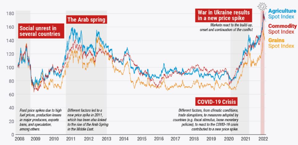 각 실선이 가파르게 상승하는 기간이 '다양한 국가에서의 사회적 불안', '중동의 아랍의 봄', '코로나19 팬데믹', '우크라이나 전쟁' 기간과 겹친다는 것을 확인할 수 있습니다.