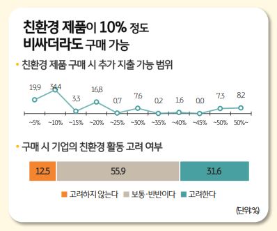 KB금융그룹이 발간한 ‘KB트렌드 보고서: ESG와 친환경 소비행동’ 리포트(2021년 9월 발간)에 따르면 대한민국 소비자의 3분의 1은 ‘제품구매 시 기업의 친환경 활동여부’를 고려하고 있는 것으로 나타났습니다. 또한 친환경 제품이 10%정도 비싸더라도 구매의사가 있다고 답했습니다.