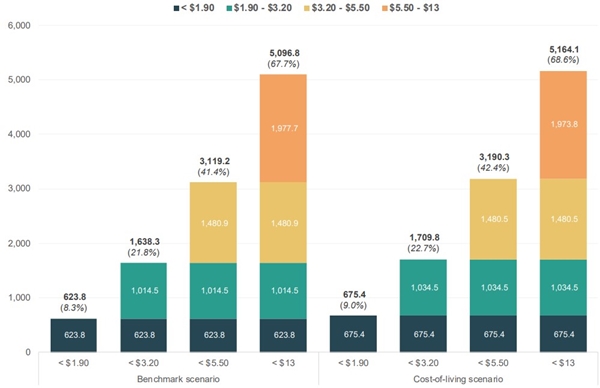 보고서에 따르면 러시아-우크라이나 전쟁 이후 3개월간 치솟은 식량과 에너지 가격으로 인해 하루 생활비가 1.9달러인 인구는 약5,160만명 증가해 6억7,550만명이 되었습니다. 그리고 하루 3.2달러 이하로 생활하는 사람은 추가로 2,000만명이 늘어났습니다.