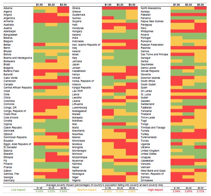 아래 표는 물가상승으로 인해 받는 빈곤 영향을 열 지도로 표시한 것인데요, 붉은색에 가까울수록 더 빈곤한 나라라는 의미입니다.