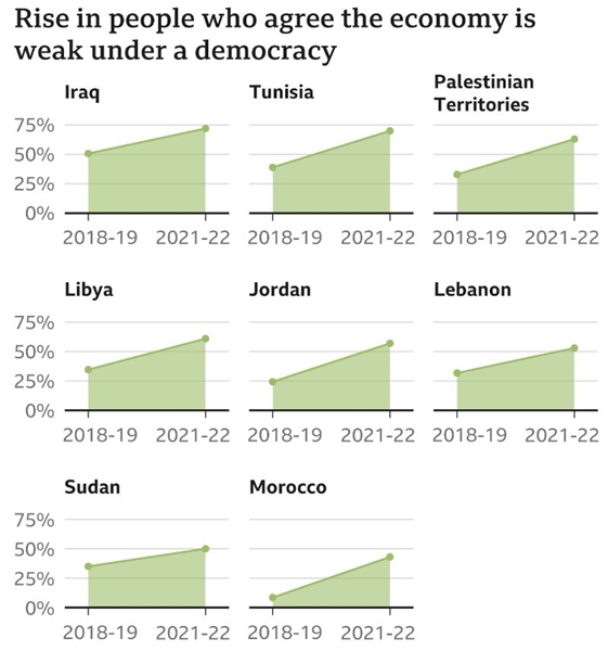 최근 중동 및 북아프리카의 아랍권 국가 국민 사이에서 민주주의 체제에서는 경제적 안정을 이루기 어렵다는 인식이 점차 커지고 있다는 새로운 조사 결과가 나왔습니다. 빈곤 때문에 민주주의에 대한 기대가 꺾이고 있는 것입니다.