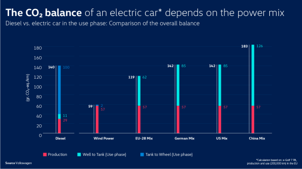 폭스바겐그룹은 태양광, 풍력과 같은 재생에너지원을 전기차에 사용할 경우 이산화탄소 배출량은 EU 전기혼합 기준으로 킬로미터당 62g에서 2g으로 획기적으로 떨어질 것으로 예상했습니다.