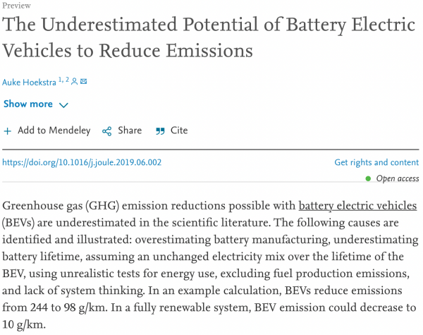 2019 네덜란드 과학저널에 게재된 '배출량을 줄이기 위한 배터리 전기자동차의 과소평가된 잠재력'이라는 보고서를 인용하며 전기차가 보다 친환경적이라는 입장 밝혔습니다.