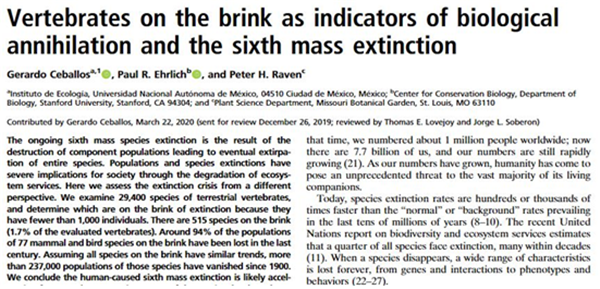 2020년 6월 미국 스탠포드 대학, 미주리 식물원(Missouri Botanical Garden), 멕시코 자치대학(Universidad Nacional Autónoma de México)의 연구진은 ‘생물학적 절멸과 여섯 번째 대량 멸종의 지표로서 벼랑 끝이 척추동물’이라는 논문을 미국립과학원회보(PNAS)에 게재했습니다.