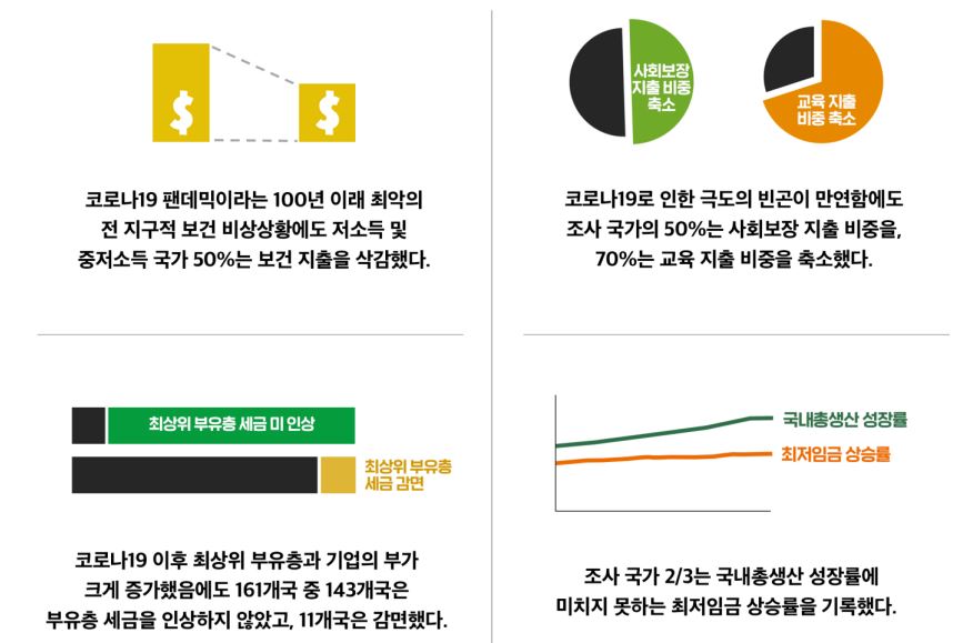 반면 부자의 부는 크게 증식되었습니다. 보고서는 조사 대상국 161개 중 143개국이 코로나 기간 중 최상위 부유층 대상 세율 인상을 하지 않았으며, 11개국은 오히려 최상위 부유층에 대한 감세를 시행했다고 꼬집었습니다. 부유층을 대상으로 세금을 인상한 국가는 7개국에 불과했습니다.