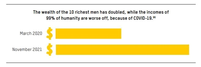 옥스팜은 지난 7월에도 불평등에 대한 보고서를 통해 세계에서 가장 부유한 10명의 부가 코로나 이후 두 배로 증가한 반면 인류의 99%의 소득은 나빠졌다고 꼬집었습니다. 러시아-우크라이나 전쟁과 에너지, 식량가격 상승은 불평등을 더욱 가속화 시켰습니다.