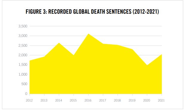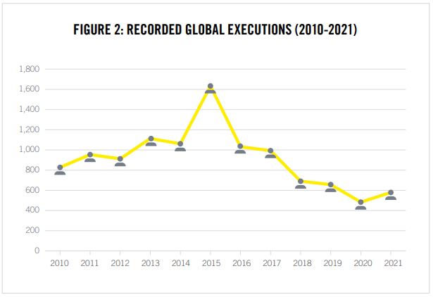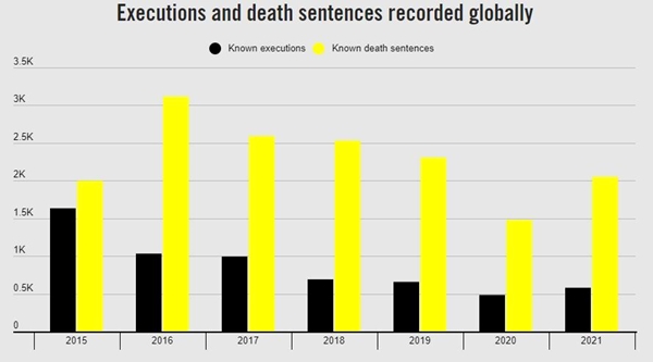 ◎ 2021년 18개국에서 579건의 사형집행이 이뤄졌는데 이는 2020년 483건보다 20% 증가한 수치입니다. 하지만 2010년 이후로는 두 번째로 낮은 기록입니다. 2020년은 코로나19로 인해 사형집행이 줄어든 것이기 때문에 사실상 2010년 이후로는 2021년이 가장 낮았다고 볼 수 있습니다.