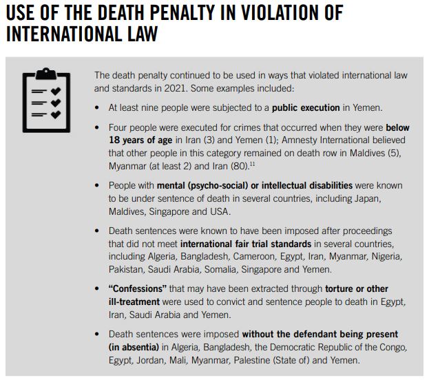 ◎ 국제법과 기준을 위반한 사례도 있습니다. 이란, 예멘 등 일부 국가는 범죄를 저질렀을 때 18세 미만이었던 사람들을 처형했습니다. 일본, 싱가포르 등의 국가는 정신 및 지적 장애가 있는 사람들에게 사형을 선고하기도 합니다. 알제리, 방글라데시, 이집트, 요르단 등의 국가는 피고인을 참석시키지 않는 등의 불공정한 재판 후에 사형을 선고합니다.