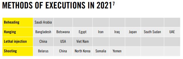 ◎ 2021년 말까지 최소 28,670명이 사형선고를 받았습니다. 이라크(8,000명 이상), 파키스탄(3,800명 이상), 미국(2,382명), 방글라데시(1,800명 이상), 베트남(1,200명 이상) 등입니다.