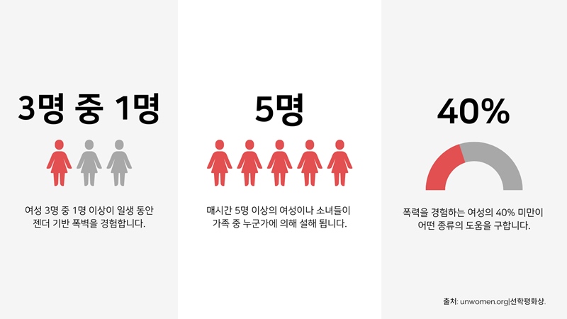 여성에 대한 젠더 기반 폭력은 세계에서 가장 만연한 인권 침해입니다. 전 세계적으로 여성 3명 중 1명은 일생 동안 신체적 또는 성적 학대를 경험하는 것으로 추산됩니다.
