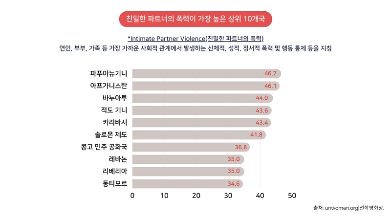 친밀한 파트너 폭력이 가장 높은 국가는 파푸아뉴기니, 아프가니스탄, 바누아투, 적도기니, 키리바시, 솔로몬 아일랜드, 콩고민주공화국, 레바논, 라이베리아, 동티모르 순입니다.