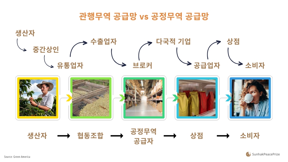 관행 무역은 생산자→ 중간상인→ 유통업자→ 수출업자→ 브로커→ 다국적기업→ 공급자 → 상점→ 소비자의 복잡한 과정을 거칩니다. 이 과정에서 중개인들의 이득을 가져가기 때문에 상품 가격은 계속 부풀려집니다.