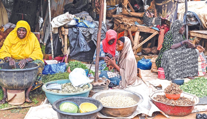 니제르 우알람의 난민 캠프에서 여성들이 야채와 향신료를 판매하고 있습니다. 2023년 8월 니제르에서는 쿠데타로 식량 안보 위기가 심각합니다. 니제르는 쿠데타 이전에도 이미 300만 명이 넘는 사람들이 계속되는 심각한 식량 불안에 시달렸습니다.