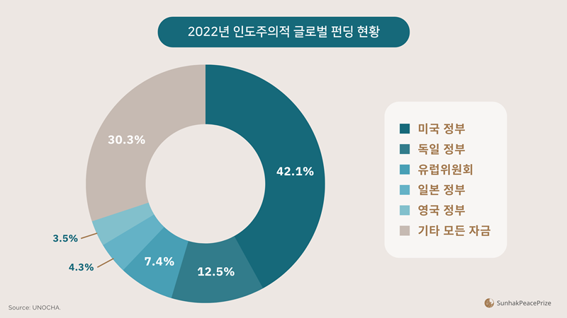 생존이 위태로운 사람들에게 기본적인 필요를 제공하는 것은 국제 사회 전체의 공동 책임이어야 합니다. 그러나 2023년 현재 인도주의적 원조는 최대 기부 10개국이 전체 자금의 82.4%를 제공하고 있는 형편입니다.