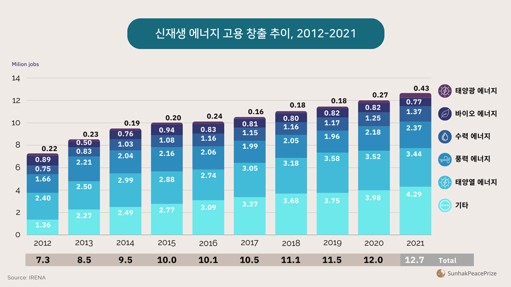 출처 : Evolution of global renewable energy employment by technology, 2012-2021/ IRENA