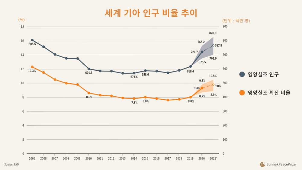 2022년 식량농업기구(FAO)와 국제농업개발기금(IFAD), 유엔아동기금(유니세프), 세계식량계획(WFP), 세계보건기구(WHO)가 발표한 '2022 세계 식량 안보와 영양 현황' 보고서에 따르면, 2021년 전 세계 기아 인구는 7억 6천800만 명(최소 7억 200만 명, 최대 8억 2천800만 명)으로 추산됩니다.