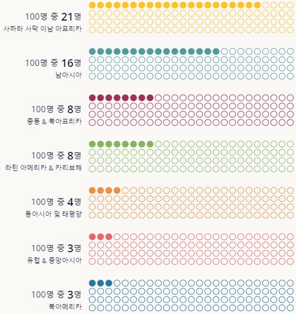 세계은행(World Bank) 최근 자료에 따르면 2021년 기준 약 8억 2천800만 명이 영양실조 상태입니다. 이는 전 세계 인구 10명 중 1명에 해당하는 수치입니다. 특히 사하라 이남 아프리카, 남아시아, 중동 및 북아프리카 등 여러 지역의 영양실조가 심각합니다.
