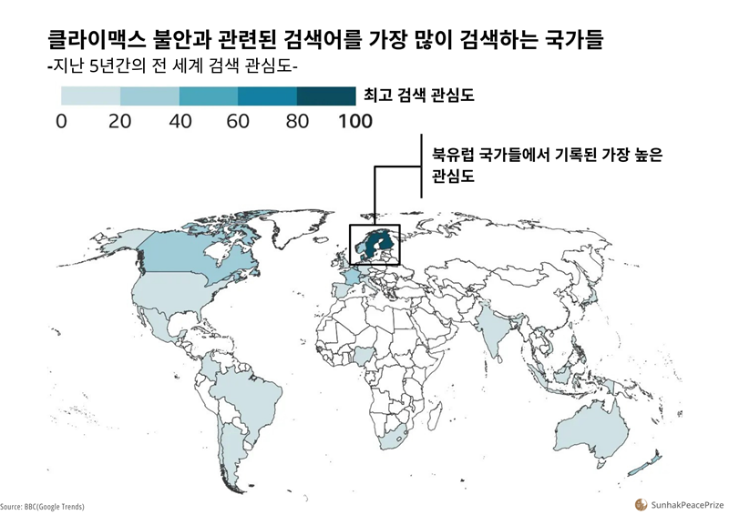 전 세계에서 “기후 불안”을 가장 많이 검색한 국가는 북유럽 국가들이었어요. 관련 검색량의 40% 이상이 핀란드, 스웨덴, 덴마크, 노르웨이에서 검색되었습니다.