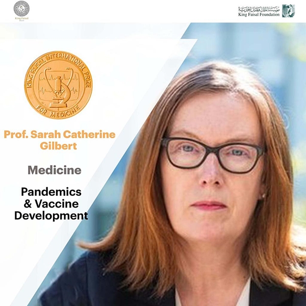옥스포드-아스트라제네카 코로나19 백신을 접종한 여성인 사라 길버트 옥스퍼드 대학교 너필드 의학과의 백신학 학과장파이살 왕 의학상 수상자로 선정됐습니다. 그녀는 효율성, 저렴한 비용 및 접근성으로 인해 수십억 명의 생명을 구하는 180개 이상의 국가에서 사용되고 있는 백신을 공동 개발했습니다.